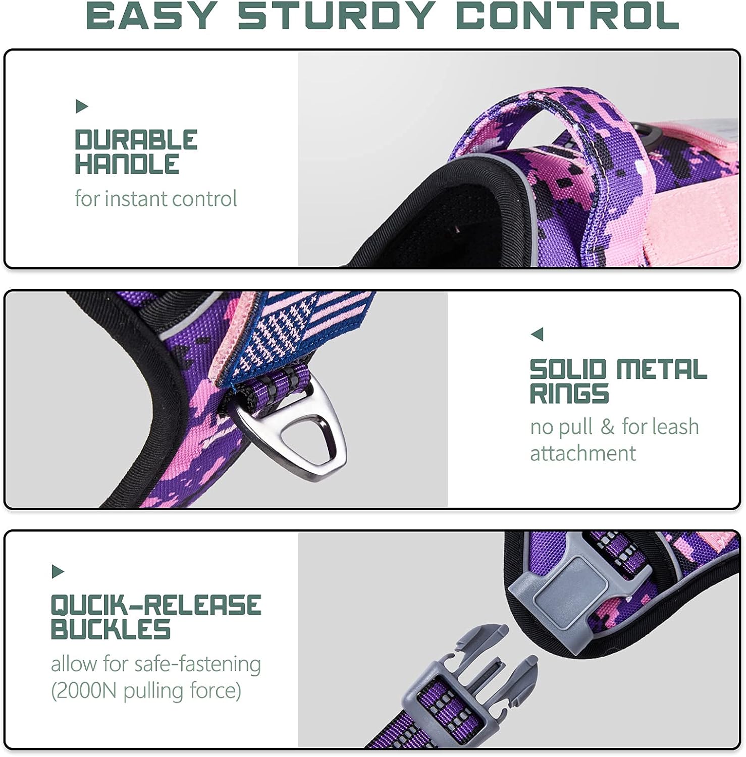 - 🐾NO PULL & STURDY BUCKLES: Provide better dog harness for dogs.🐾 Bumbin dog harness is equipped with 2 Sturdy Metal D-Rings for connecting the leash, reinforced on the extensional part. One Front Clip for No Pull control or dog training. One Back Clip for casual walking or jogging. Our plastic buckles withstand 2000N pulling force to ensure it won't be easily damaged. Recommended Large Dogs, such as Shepherd, Newfoundland, Doberman, Labrador, Alaska, German Shepherd, Large Bulldog, etc.