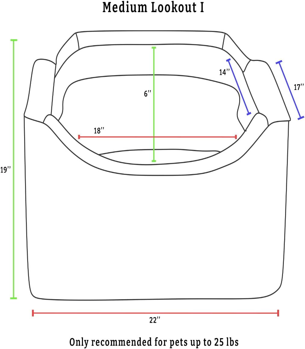 - This dog booster seat for small dogs under 25 lbs raises your pup 6” to allow easy viewing out of the window. The removable pillow can add additional height if necessary. The enveloping microsuede interior is 18” x 14” and boasts 6” tall sidewalls to secure small breed dogs under 17” in length (like pugs, corgis, and dachshunds) within the dog car seat. The Lookout dog car seat measures 17″H x 22″W x 19″L and is an ideal back seat or front seat dog car seat, fitting snugly inside a single seat.
