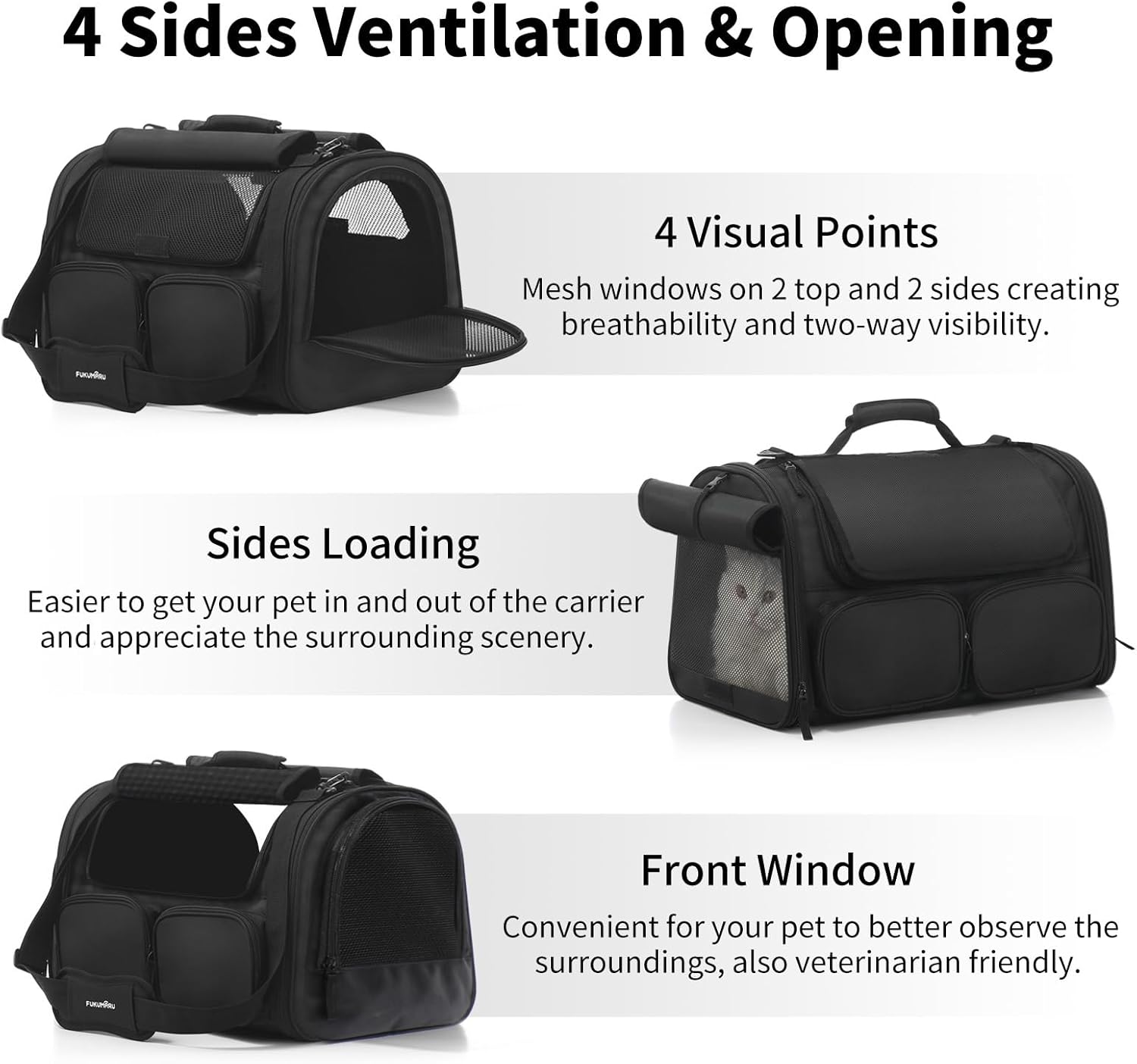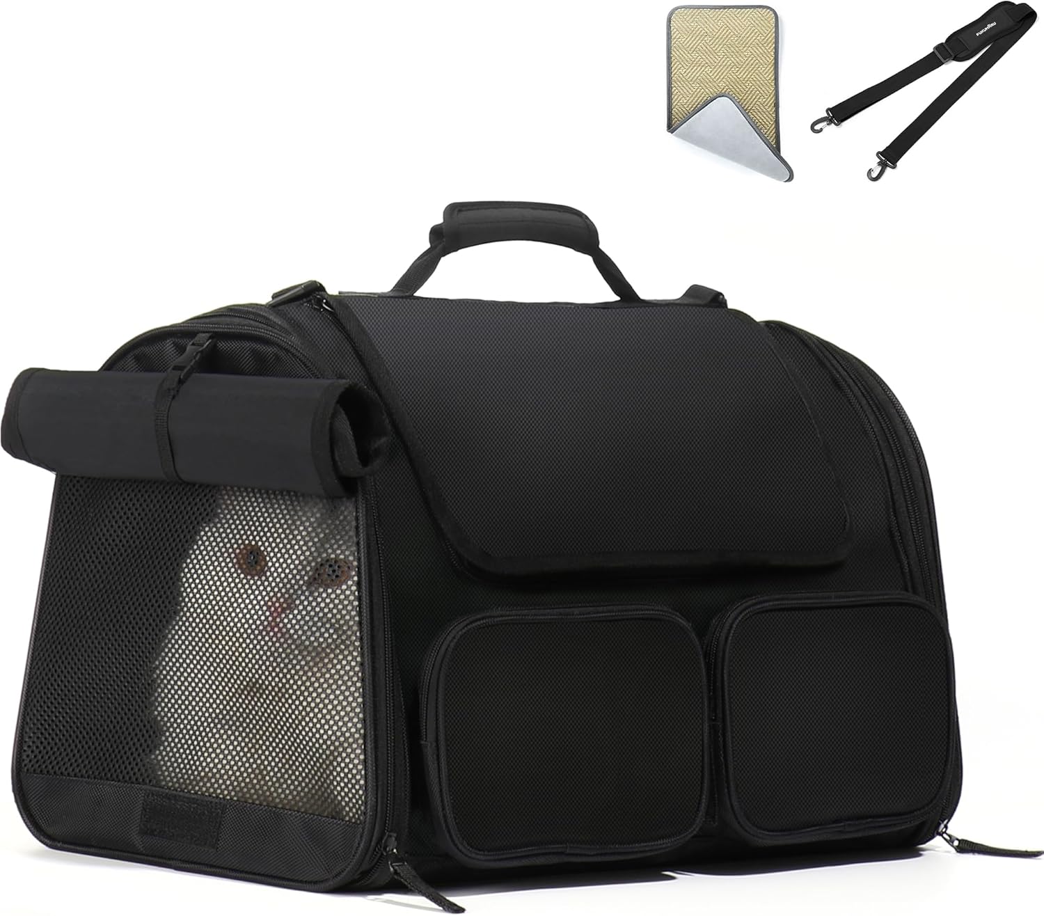 FUKUMARU Cat Carrier, 4 Mesh Windows Small Dog Carrier, 4 Storage Pockets Cat Travel Bag, Under 15 lb Airline Approved Pet Carrier, Rollable Cover for Nervous Cats, Black