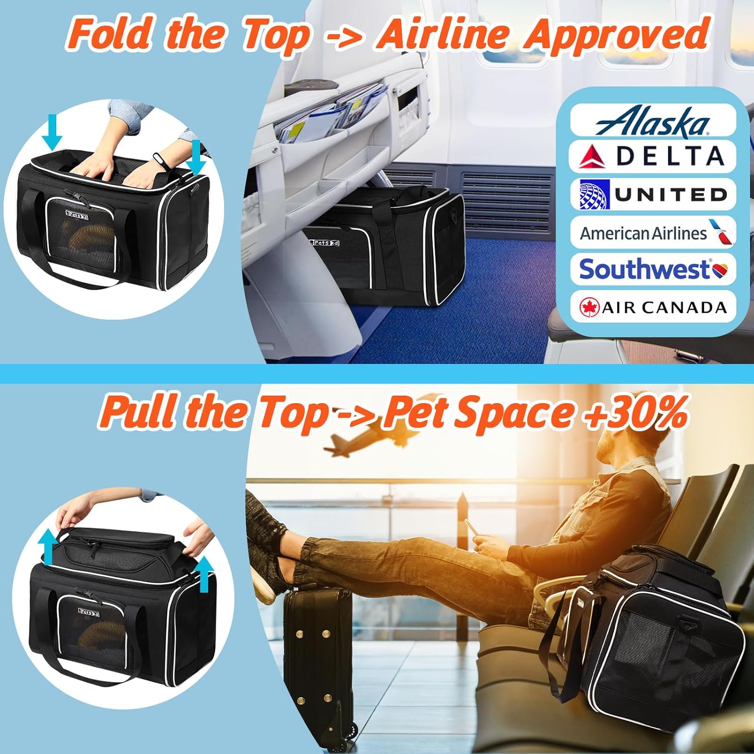 - 【AIRLINE APPROVED CARRIER 】Unfolded size:17"L×11"W×(9.5+3.5)"H, Petskd pet carrier is TSA approved and can be placed under the seat in the cabin, it is mainly designed for ①Alaska Airlines:17x11x9.5", but also in compliance with ②Southwest Airlines:18.5x13.5x9.5" ③Delta Airlines:18x11x11" ④United Airlines:18x11x11" ⑤American airlines:18x11x11" ⑥Air Canada:21.5x15.5x10.5". We recommend you buy this carrier when you fly with the above-mentioned airlines.