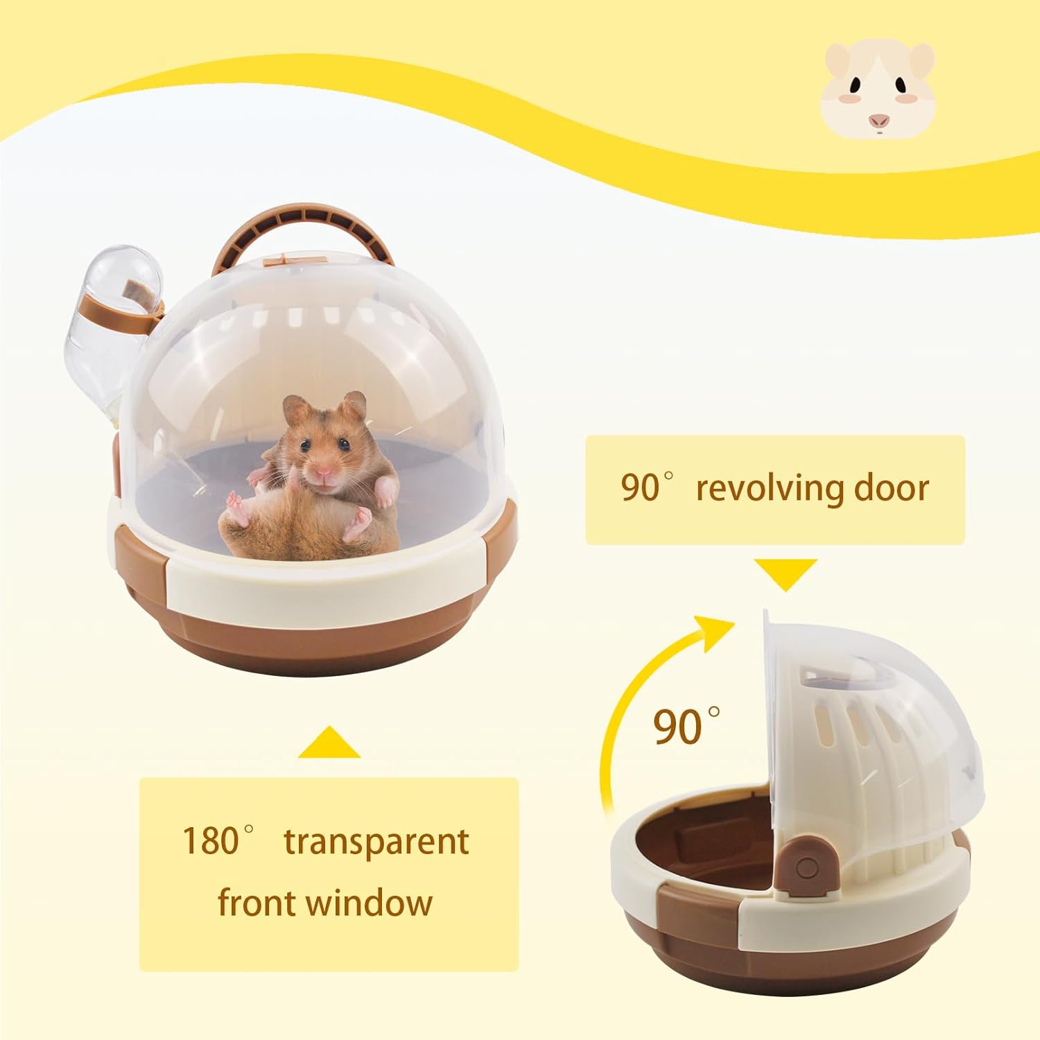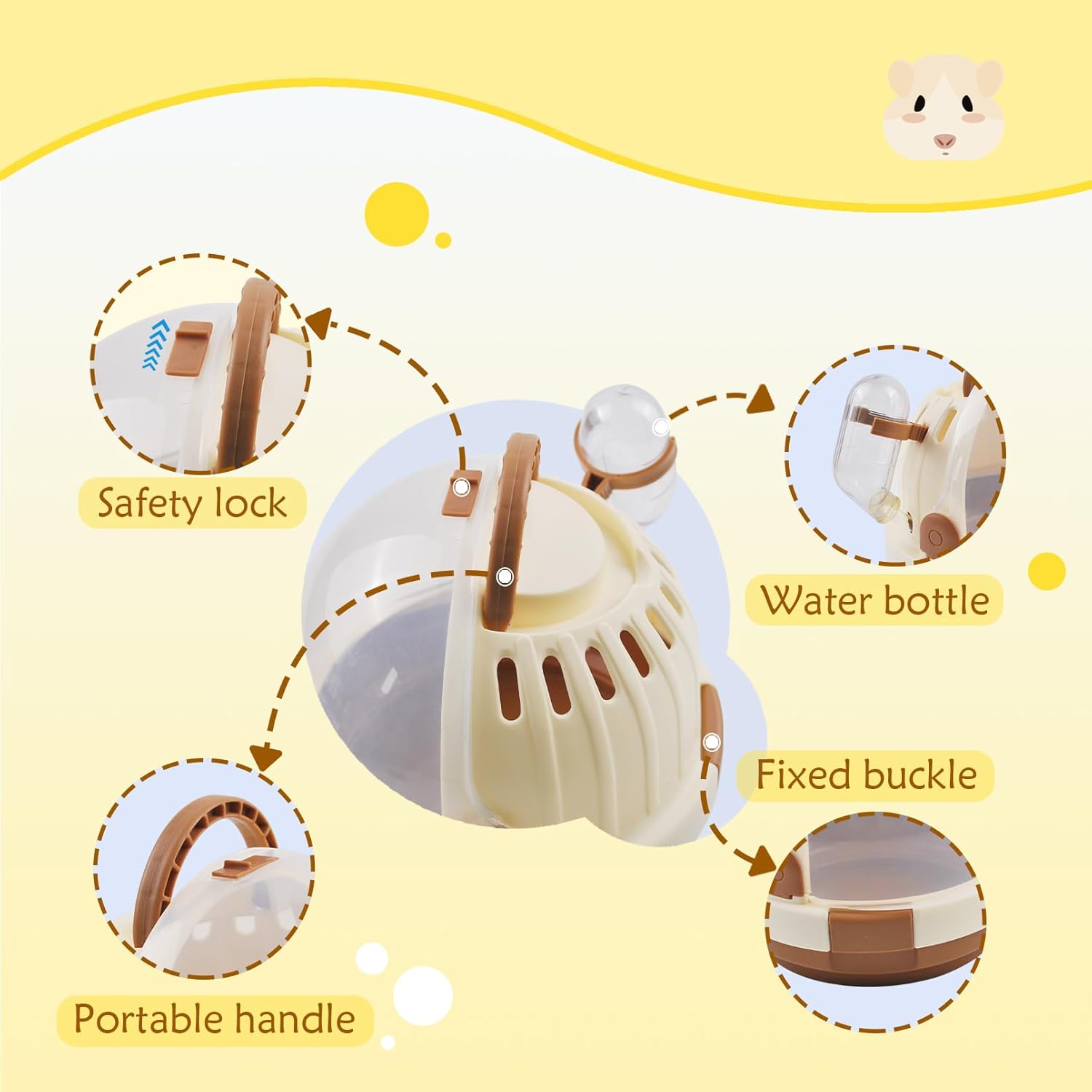 - Ventilation:The ventilation design at the top of the hamster cage increases air circulation,allowing your hamster to breathe smoothly and freely,Travel is more reassuring, meeting the natural exploration and hiding needs of hamsters