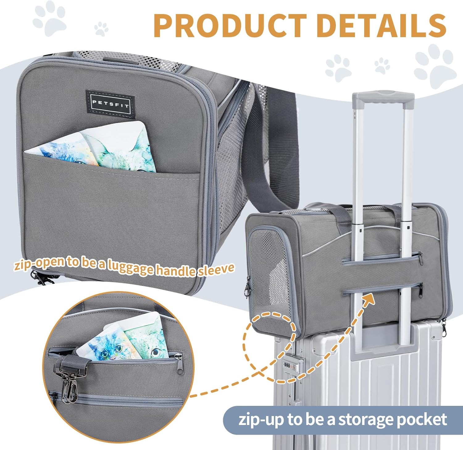 Petsfit Airline Approved Pet Carrier for Small Dogs & Cats, 19x9x12 TSA Approved Carrier, with Removable Dual-Sided Padding (2-Way Placement) - Fits Under Most Airplane Seats, Escape Proof (Gray)