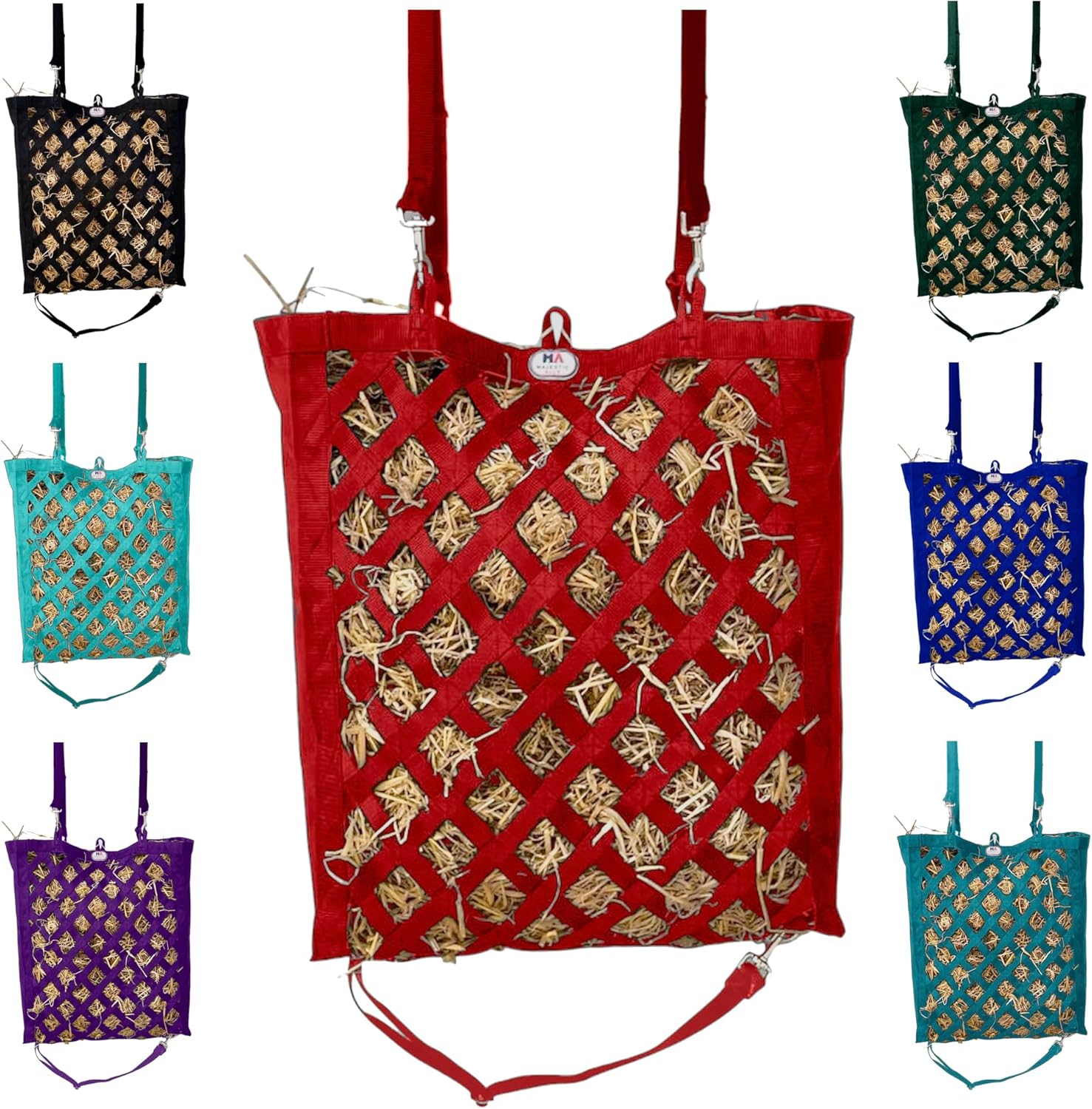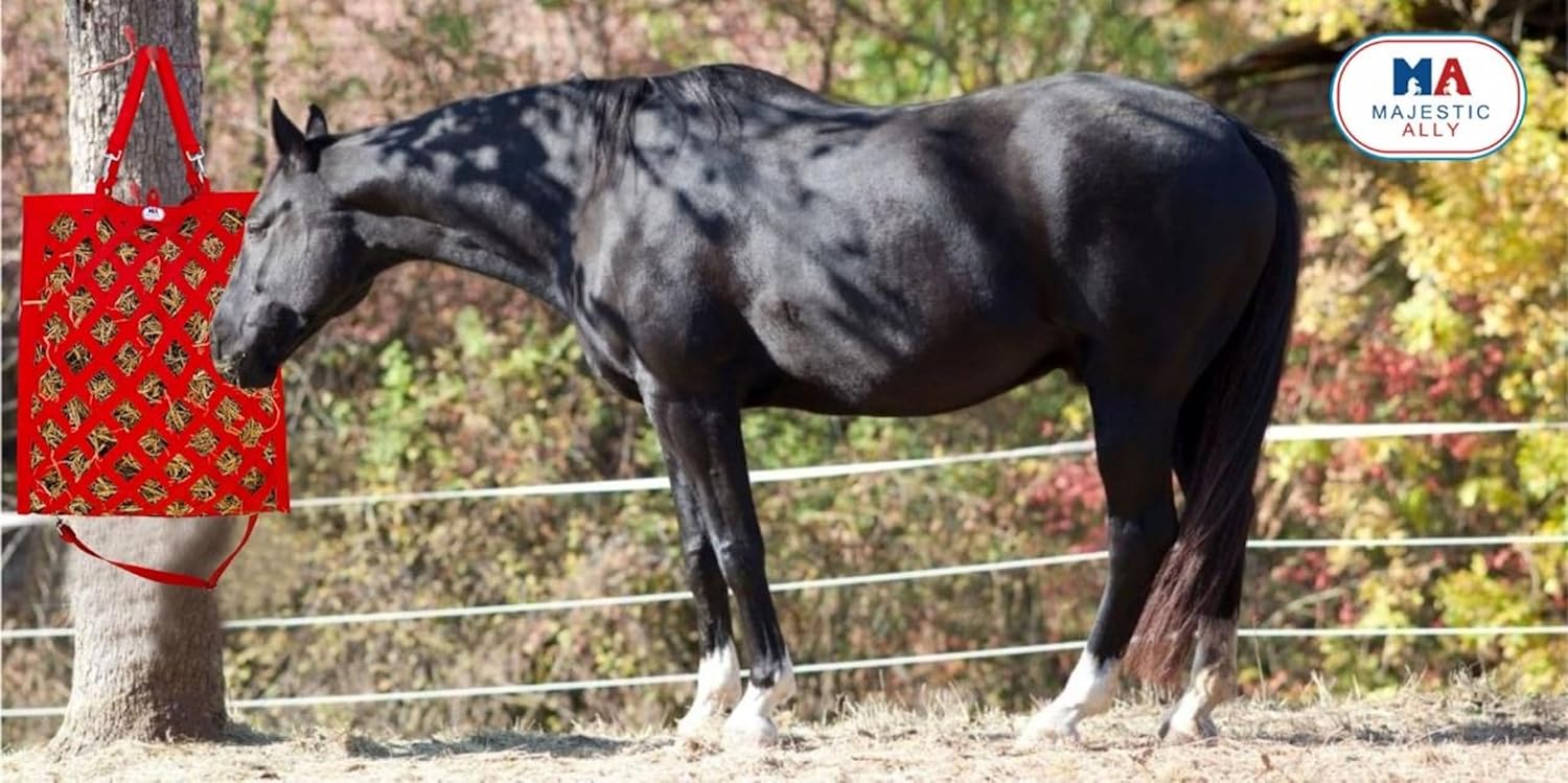 Majestic Ally Premium Nylon Hay Bag for Horses and Livestock, Simulates Grazing, Slow Feeding, Heavy-Duty PP Webbing,Quick-Adjust Straps, Small Hole for Digestion, Multiple Colors (Red)