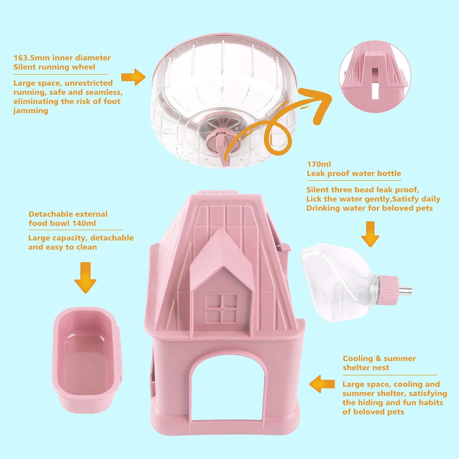 - 4 in 1 Design: The hamster exercise wheel consists of a silent hamster wheel, a detachable hamster food bowl, a No Drip hamster water bottle, and a stable shelter base. Create a perfect habitat for your beloved pet.