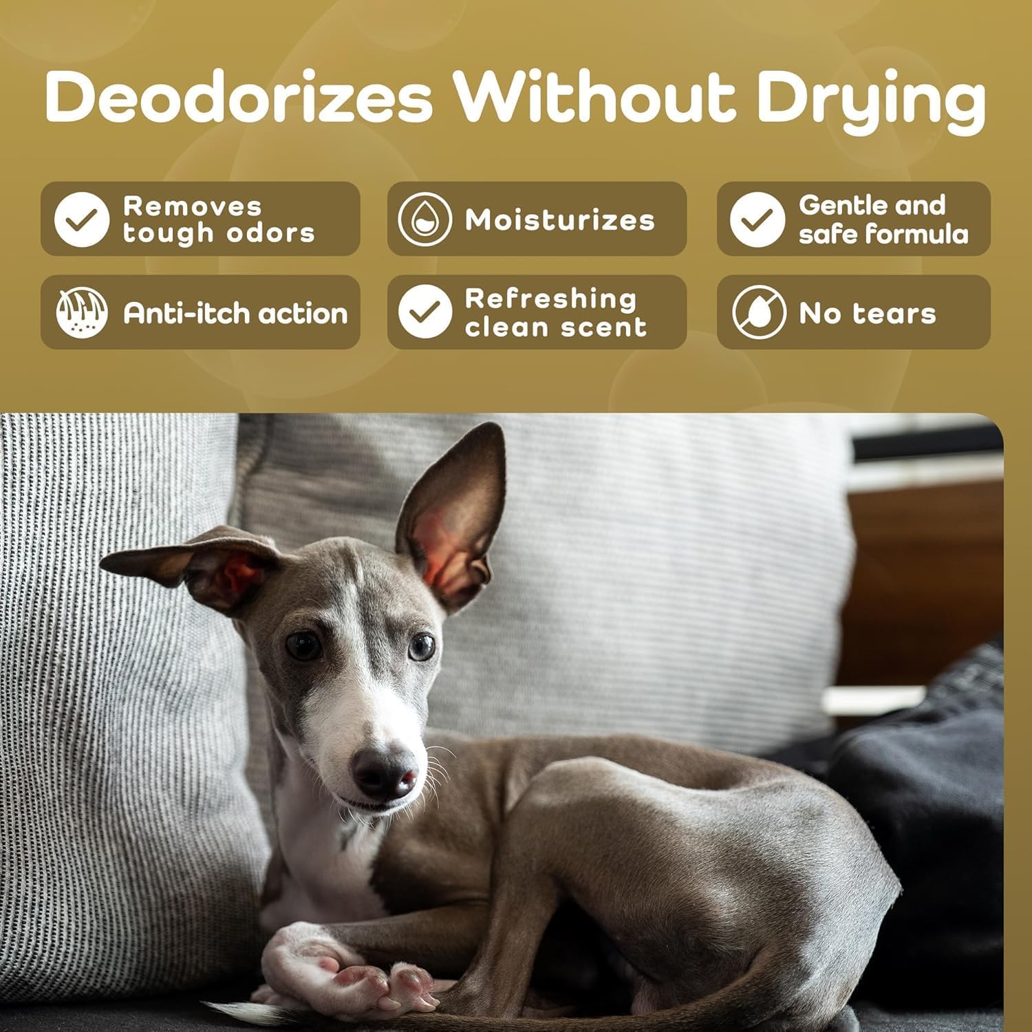 - Enhanced Coat Support – Developed to nourish and reinforce your dog’s coat with aloe vera, argan oil, chamomile, and grape extract, this hydrating dog shampoo supports thick and short fur alike. Regular use leaves coats noticeably softer, shinier, and smelling fresh—perfect for dogs with thin, sensitive skin and short hair, such as Greyhounds, Whippets, Basenjis, Dobermans, Vizslas, Pharaoh Hounds, Manchester Terriers, and more.