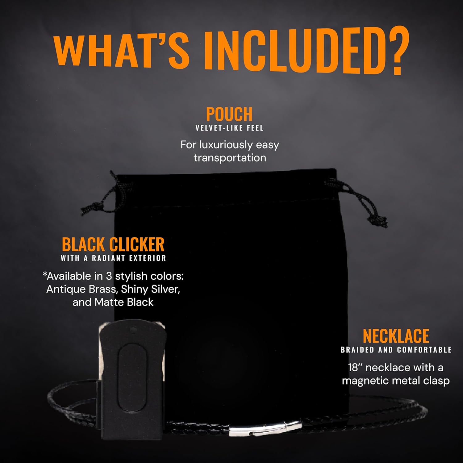 - Stand Out with Class: In a sea of ordinary clickers, our elegant Black Puppy Training Clicker sets you apart. Embrace sophistication and style while improving your dog agility. Our dog accessories clicker product has a black exterior and also features a braided leather necklace with a magnetic metal clasp that matches your style perfectly