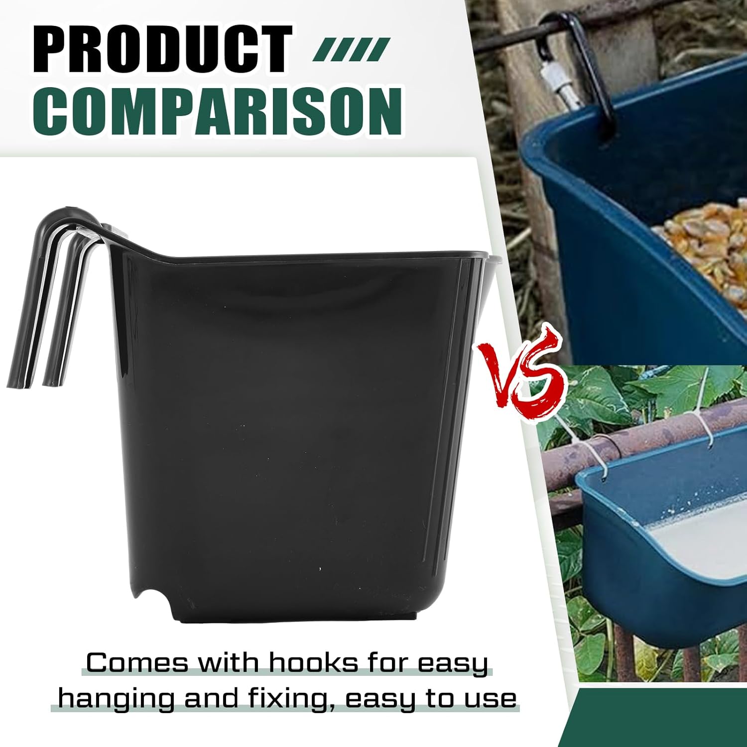 - Practical Design: this plastic hook over feeder size is approx. 11.42 x 14.96 x 12.6 inches, a nice dimension to hold a hefty amount of feed for your livestock without consuming too much space